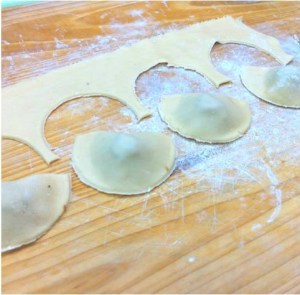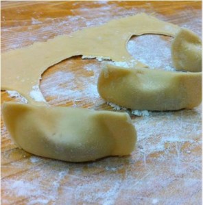Mettete i casoncelli “in piedi” sul lato rotondo e con un dito premete sulla parte diritta in alto a formare la caratteristica “barchetta”