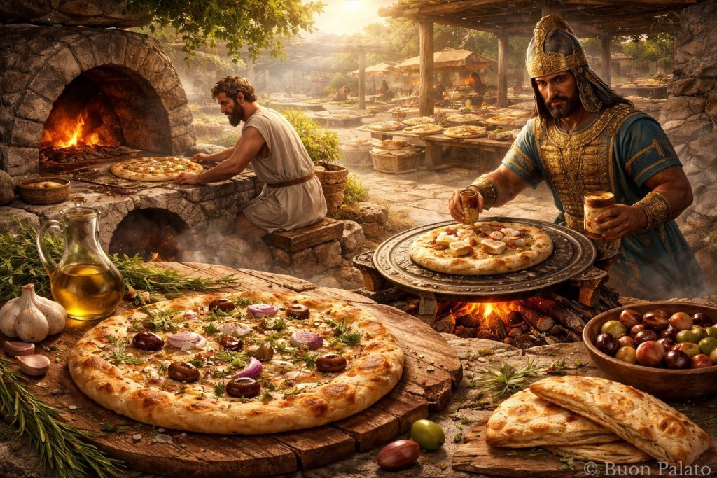 Nell’antica Grecia si mangiava un pane piatto πλακοῦς (plakous) che veniva condito con aglio, cipolla ed erbe.