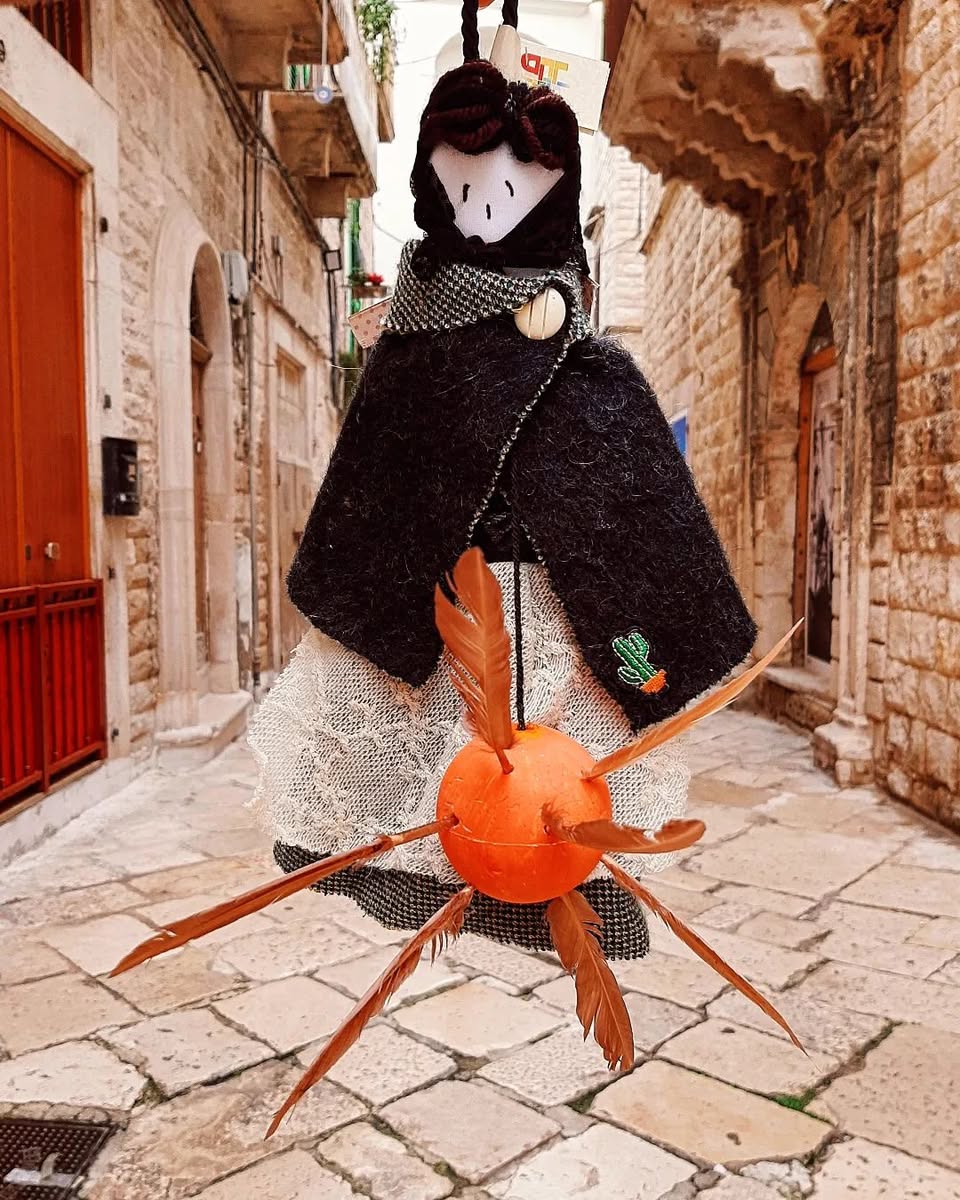 Si tratta di pupattole vestite di stracci con la faccia bianca e l’arancia con le 7 penne, di cui sei simboleggiano le domeniche di penitenza ed una la Pasqua.