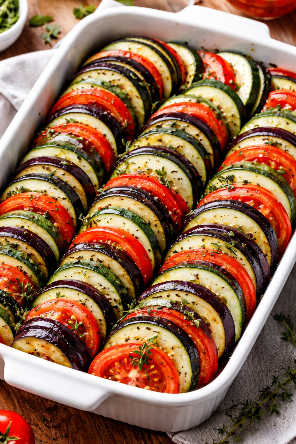 In una pirofila ben unta con l’olio disponete alternati gli ortaggi in modo da creare un buon effetto cromatico e quindi versateci sopra l’olio in maniera uniforme (colando un filo e non esagerando) salate e pepate.