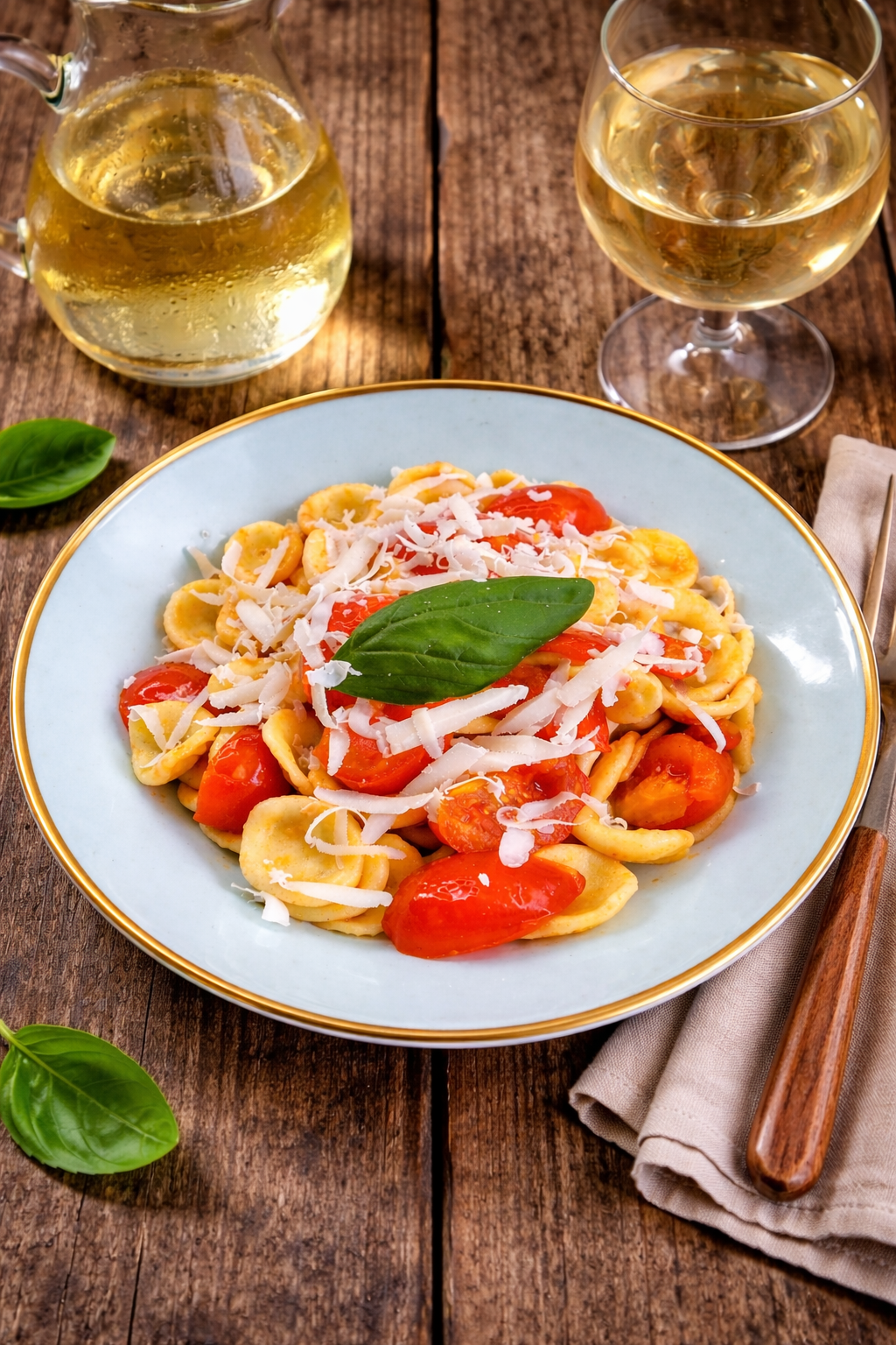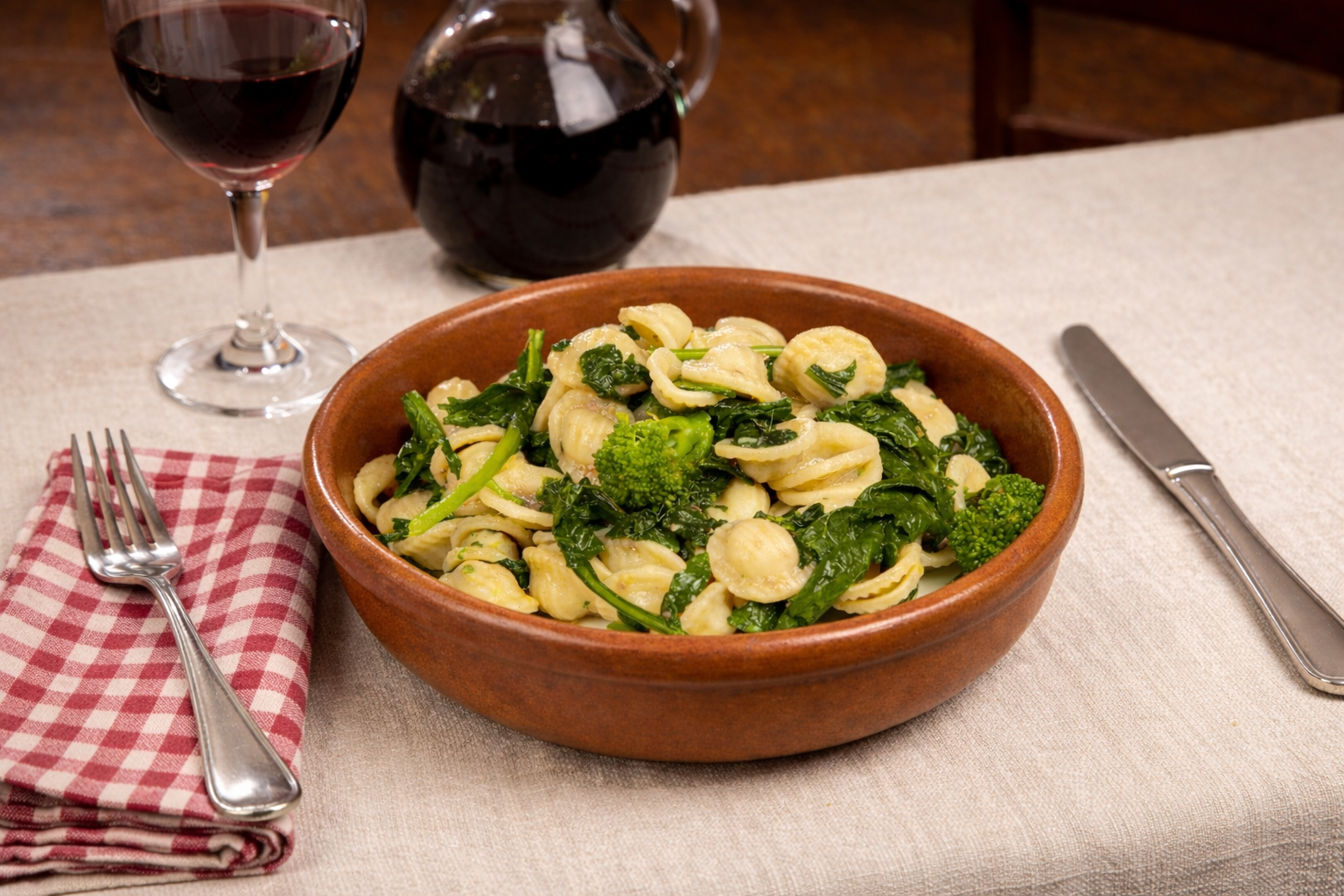 La forma concava — che ricorda una piccola orecchia — nasce da un gesto semplice: un pezzetto d’impasto trascinato col coltello e poi rovesciato sul pollice. Non è estetica fine a sé stessa: quella “conca” trattiene il condimento meglio di qualunque teoria gastronomica.