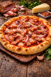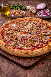 Pomodoro, mozzarella, cipolla, acciughe (varianti con olive/capperi).