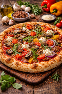 Pomodoro, mozzarella, prosciutto cotto, funghi, carciofi, olive.